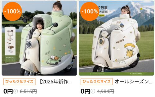 某中華系ショッピングサイトにこんなものが売ってました。言葉を失いました。 終 楽天でも売ってた!(驚) 防寒具 キッズ 親子 電動アシスト自転車 防風 防寒 ケープ 冬用 裏起毛 厚手 防水 大判 電気自動車 バイク スクーター価格: 5465 円楽天で詳細を見…