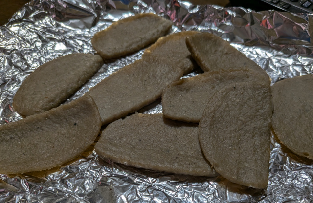 さて話がだいぶ脱線したので元に戻します。家にかえってどうやって食べるのか考えたんですけど、結局はんぺんを袋から出し、オーブンで軽く炙って食べることにしました。時間的には裏表で約10分ほどでしょうか。コンロだったらもっと速かったんでしょうけど、まあ面倒臭かったんで。ちょっと焼きめが付くくらいで仕上げました。完成したのがこれ↓です。これに生姜醤油をつけて食べました。