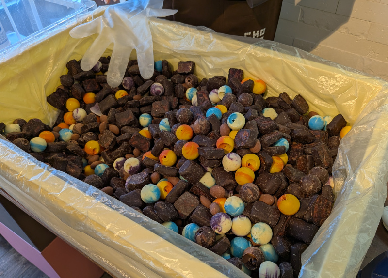 写真はほんの一部なんですが、これらの割れチョコを試食し、気に入ったものを瓶からトングで取り出して、トレイに乗せてあとは量り売りをするスタイルです。
